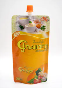 მზესუმზირის ზეთი, წყალი, შაქარი, სუფრის მარილი; შემასქელებლები: მოდიფიცირებული სახამებელი, შეიცავს კვერცხის ფხვნილს, გუარის გუმფისი, ქსანტანის გუმფისი; მჟავიანობის რეგულატორები: ლიმონმჟავა, ძმარმჟავა; კონსერვანტები: კალიუმის სორბატი, ნატრიუმის ბენზოატი; არომატიზატორი: მდოგვის არომატიზატორი ბუნებრივის იდენტური; საღებავი: B კაროტინი; სანელებლების ნარევი ცვალებადი პროპორციით.